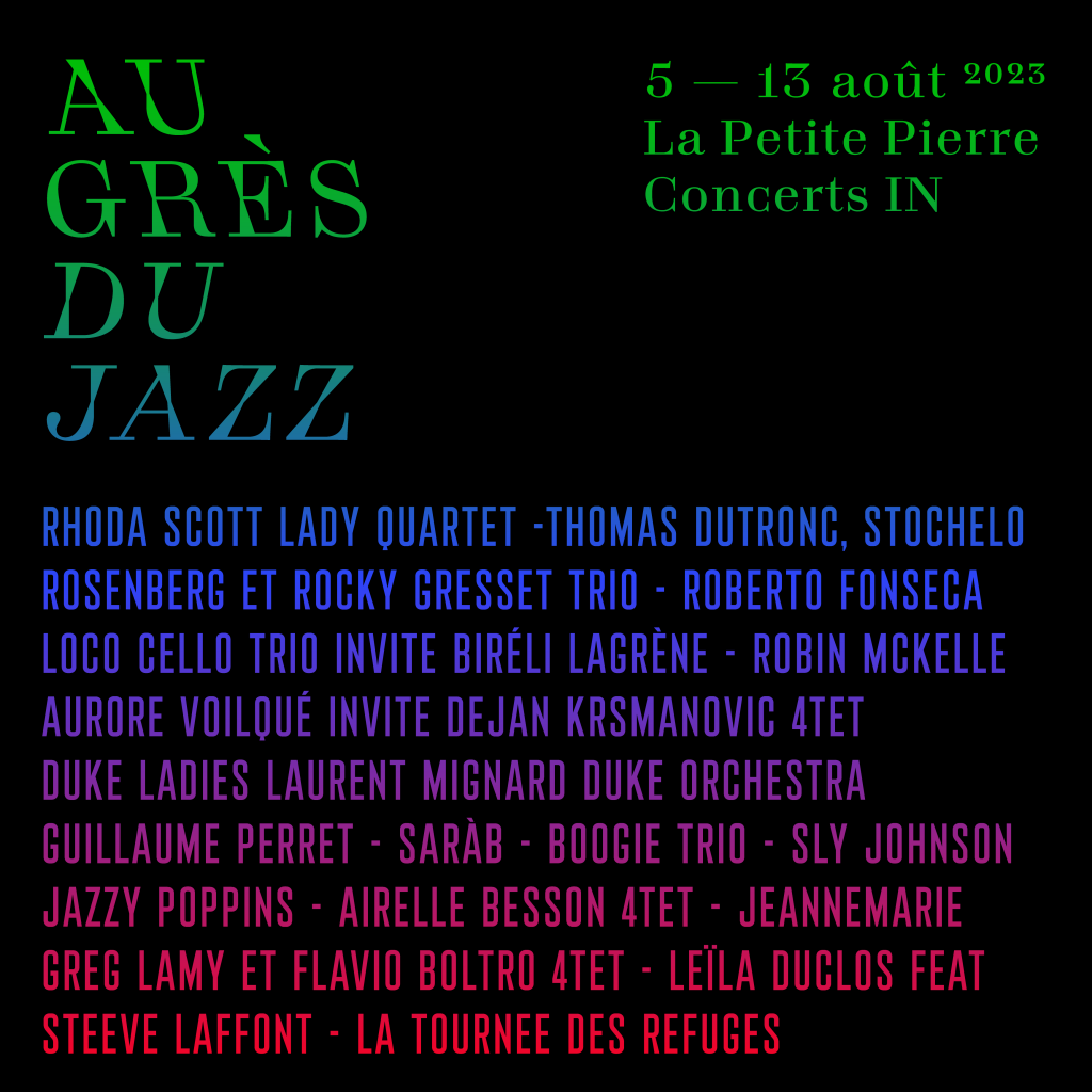 Sur le chemin de ses vingt ans, le festival Au grès du jazz fête sa 20ème édition ! L’équipe du festival a le plaisir de vous dévoiler la programmation du IN et de vous donner rendez-vous du samedi 05 au dimanche 13 août 2023 à La Petite Pierre et ses environs, en plein cœur des Vosges du Nord.